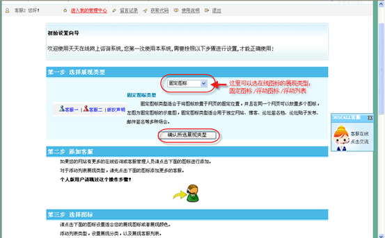 在kf000在線客服系統(tǒng)初始設(shè)置向?qū)е,選擇一種在線圖標(biāo)的展現(xiàn)類(lèi)型(默認(rèn)是固定圖標(biāo)),再點(diǎn)擊“確認(rèn)所選展現(xiàn)類(lèi)型”: