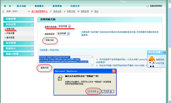 點(diǎn)擊“獲取代碼”按鈕,得到代碼,點(diǎn)擊“復(fù)制代碼”,選“允許訪問(wèn)”,就把獲取的代碼復(fù)制好了,這時(shí)只要再粘貼“到網(wǎng)站的相關(guān)頁(yè)面的 </html> 的前一行”即可。