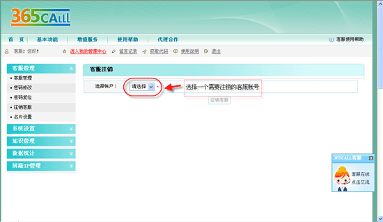 如要注銷某個(gè)客服賬戶,點(diǎn)擊“客戶管理” -> “注銷客服”,選擇一個(gè)需要注銷的客服: