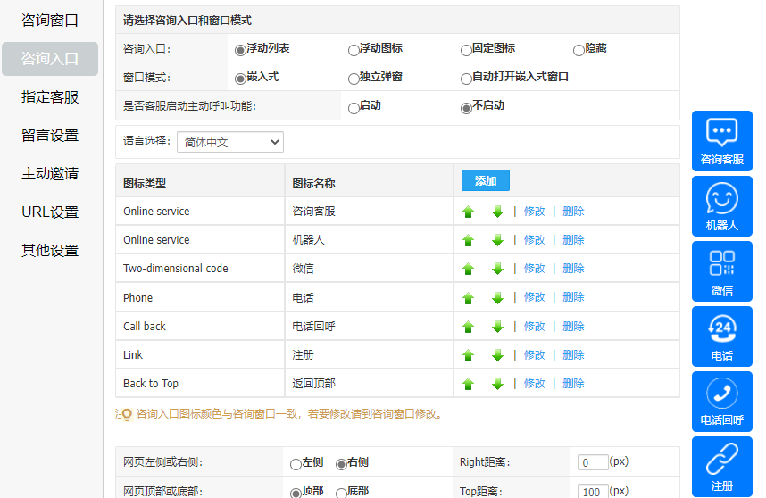 訪客可在客服休息時間或忙碌未及時回復時將自己的聯(lián)系方式留下,等待客服回呼解決問題,可在“系統(tǒng)設(shè)置-媒體對接-網(wǎng)頁(網(wǎng)站)-設(shè)置-咨詢?nèi)肟凇?/span>